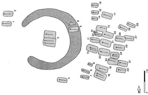 - Bei diesen Gräbern handelt es sich offensichtlich um Hofgrablegen, deren Zuordnung zu einzelnen Höfen wegen der starken Befundüberlagerungen allerdings im Augenblick nicht möglich ist.