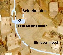 Der Plan von 1816 zeigt auf dem Platz "An der Schleifmühle" bei der Mühle vermutlich eine Ross-Schwemme, welche bei den beiden Sandtnermodellen vom Ende des 16. Jhs nicht zu erkennen ist.