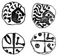 Ein Kreuz, dessen Balken sich bis an den Rand der Münze fortsetzen, mit verschiedenen Zeichen in den vier Winkeln, bildet den gewöhnlichen Typus der jüngeren, zumeist sehr roh geprägten Münzen dieses Volksstammes." (Bd. II, S. 140.)