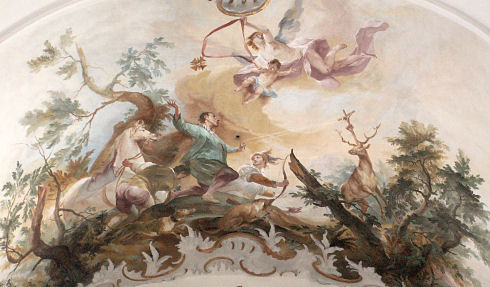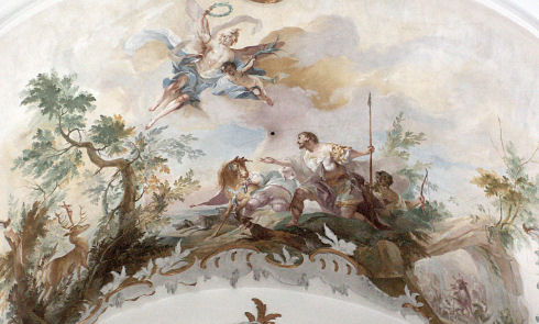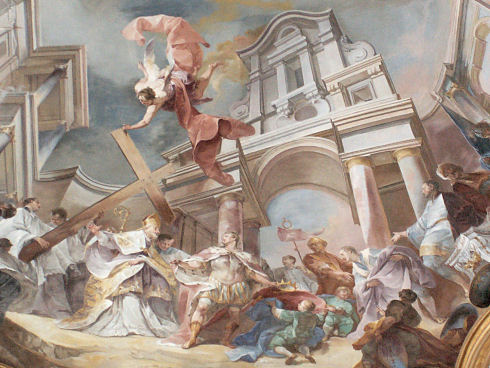 Die zehn Fresken hat der Augsburger Meister Johann Wolfgang Baumgartner gemalt. Sie stellen die Verehrung des Heiligen Kreuzes dar:
