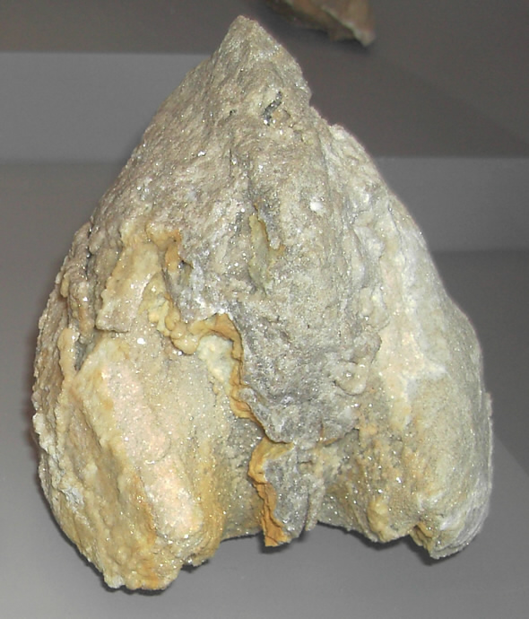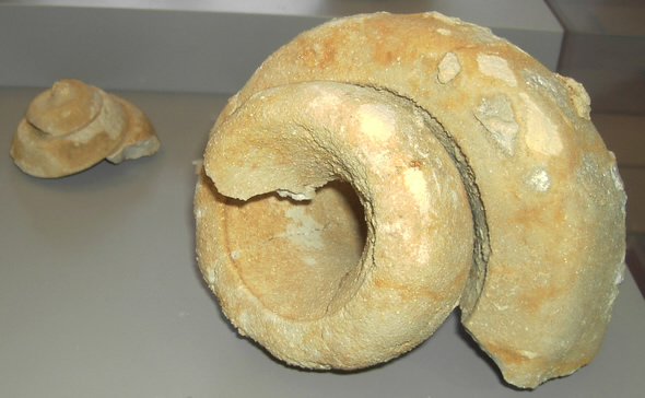 - In der Vitrine befinden sich ein Stoßzahn und ein Kauzahn eines Mammuts, versteinerte Schnecken, Muscheln und Korallen.