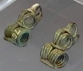 - Die beiden Manchinger Bronzedrahtfibeln mit Spiralrollenbügel waren durch ein feingliedriges Bronzekettchen miteinander verbunden.