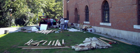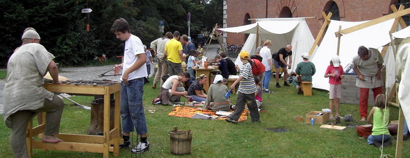 Aufbau der fünf frühmittelalterlichen Zelte der Gruppe »Coraces Danubii« am Mittwoch 01.08.2007 vor dem Stadtmuseum Ingolstadt. Angenehmerweise am Abend im Schatten des Festungsgebäudes.