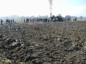 Die hier vorgeführte Methode des Pflügens mit Dampfkraft war eine aufwendige und teuere Technik. Zwei gewaltige Lokomobilen, also selbstfahrende Dampfmaschinen, ziehen einen vielscharigen Kipp-Pflug an einem Seil durch den Acker. Das Feld selbst brauchte hierbei von den schweren Maschinen nicht befahren zu werden, so dass es sich um eine sehr bodenschonende Art des Pflügens handelte. Dafür waren die Anschaffung und der Betrieb einer solchen Dampfpflug-Garnitur ausgesprochen teuer.