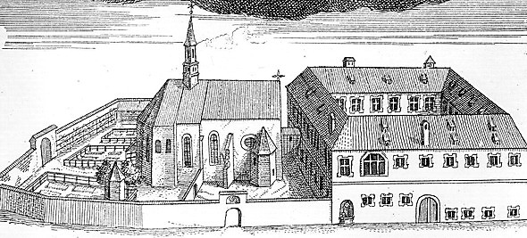 1606 erhielten die Augustiner-Eremiten Kirche und Benefiziatenhaus. 1665 wurde das Kloster (r.) als einfache Vierflügelanlage errichtet. 1683 erfolgte die Erhebung zum Konvent. (Stich von J. M. Steidlin, 1740)