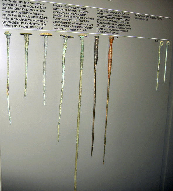 - Mit dem dehnbaren und geschmeidigen Kunststoff des Metalls ist das überholt, entsteht eine Fülle von Einzelformen z.B. von Gewandnadeln verschiedenster Größe, gibt es neben starren Ringen flexible Spiralen, kann außer massivem Gussschmuck dünner Blechschmuck hergestellt werden.