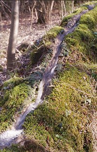 - Die Rinne befindet sich in einem Laubwald, der eine üppige Bodenflora aufweist (Moose, Farne u. a.).