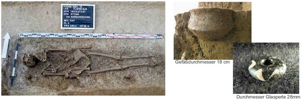 - Ganz in Westen des Trassenabschnitts wurde die bislang einzeln liegende Körperbestattung einer Frau gefunden, die wegen einer nierenförmigen eisernen Gürtelschnalle, Glasperle, Eisenmesser und einem Knickwandgefäß in einer Grabnische zu den sehr seltenen Gräbern der ersten Jahrhunderthälfte des 5. Jahrhunderts gehört.
