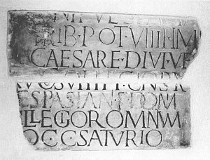 - "Unter dem Kaiser Titus Vespasianus, dem Sohne des vergötterten Vespasianus, dem Pontifex maximus, im neunten Jahr seiner tribunizischen Gewalt, als er zum fünfzehnten Mal Imperator und zum achten Mal Konsul war, dem Vater des Vaterlandes und Zensor und unter dem Kronprinzen Domitianus, dem Sohne des vergötterten Vespasianus, Konsul zum siebenten Mal, Priester aller Priestertümer, ist unter der Leitung des Caius Saturius..."