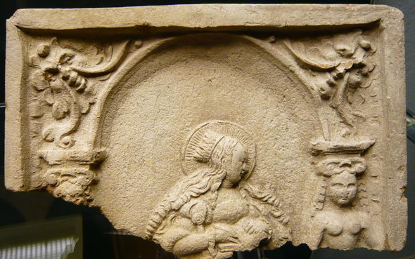 - Heilige Katharina mit Krone, Schwert und aufgeschlagenem Buch, architektonisches Rahmenwerk aus Pfeilern mit ionischen Kapitellen und vorgeschobenen Karyatiden, dazwischen Rundbogen mit Masken in den Zwickeln.
