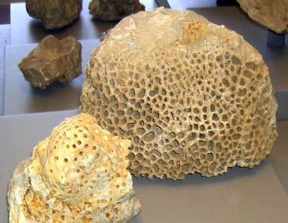 - In der Vitrine befinden sich unten die ältesten der hier gezeigten Versteinerungen, Tiere aus dem Großmehringer Korallenriff vom Ende der Jurazeit: Steinkorallen, Seeigel, Muscheln, Schnecken: