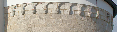 Am Rundbogenfries der romanischen Kirche von Weißendorf befinden sich außen an der Apsis 22 Konsolfiguren, elf Menschen- und elf Tierköpfe.