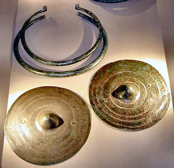 - Der Hort besteht aus 20 Ösenhalsringen und einem Halbfabrikat, einem gebrauchten Armring und zwei reich verzierten Bronzeblech-Scheiben.