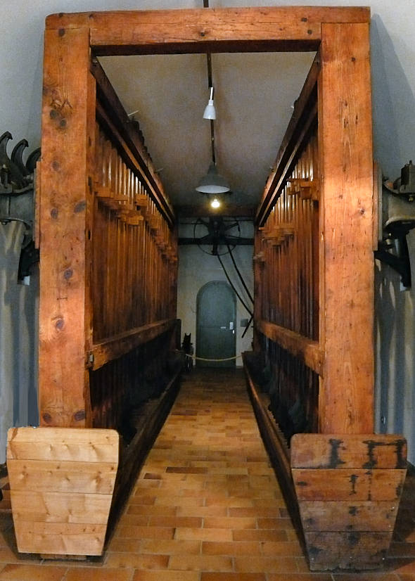 Mit Hilfe eines leistungsfähigen Elektromotors wurden die Stampfbalken über Treibriemen durch die seitlichen Eisenflügel kurvenartig in Bewegung gesetzt und somit konnten die Tröge wechselweise gefüllt und entleert werden.