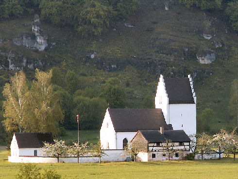 - "Die kleine Kirche mit dem wehrhaften dicken Turm steht etwa 400 m abseits vom Dorf ..."