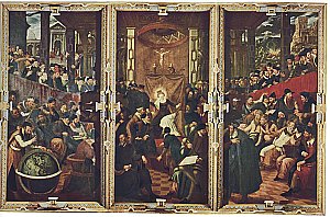 Drei Flügel zeigen die Disputation der heiligen Katharina von Alexandrien mit 50 „heidnischen“ Philosophen.