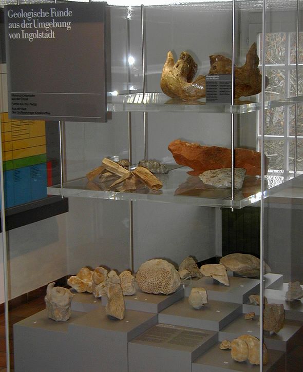 - In der Vitrine befinden sich unten die ältesten der hier gezeigten Versteinerungen, Tiere aus dem Großmehringer Korallenriff vom Ende der Jurazeit: Steinkorallen, Seeigel, Muscheln, Schnecken: